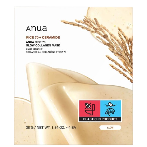 La Rice 70 Glow Collagen Mask de Anua es una mascarilla de hidrogel ultrafino (≈1 mm) formulada con 70 % de agua de arroz, colágeno de bajo peso molecular (300 Da) y ceramida NP, que trabaja para hidratar en profundidad, mejorar la elasticidad y reforzar la barrera cutánea.