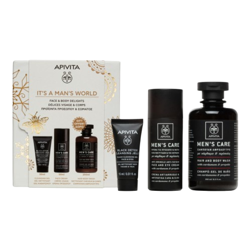 Apivita It's Man's World es un set de regalo con un elegante empaque que incluye los elementos esenciales que un hombre necesita para una piel renovada y joven. El set contiene:
