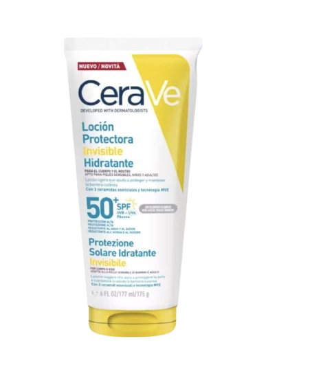 CeraVe Loción Protectora Invisible Hidratante SPF50+ está formulada para ofrecer una protección solar muy alta frente a los rayos UVA y UVB mientras mantiene la piel hidratada y confortable. Su uso diario ayuda a prevenir los daños derivados de la exposición solar, como la quemadura, el envejecimiento prematuro y la deshidratación inducida por el sol.